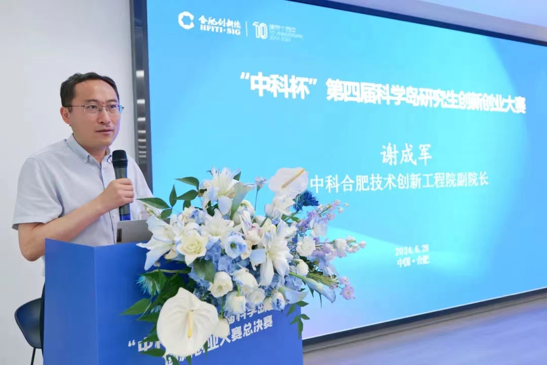 謝成軍代表創新院致歡迎辭,他表示,創新院作為合肥物質院重要的科技成果轉化平臺,聚焦數字經濟和生命健康兩大領域,始終堅持產業鏈創新鏈協同發展,建立了研發中心-中試基地-眾創空間-孵化器-加速器的全鏈條“科創+產業”生態體系,為創業團隊提供最完備的創新創業服務。截止目前,創新院已連續三年舉辦科學島研究生創新創業大賽,聚集了一大批科學島創業團隊項目成功產業化落地,希望今天的決賽現場可以涌現出更多的科技成果在創新院“生根發芽”,創新院將持續完善科技成果轉化生態體系,為選手們在創新創業的賽道鋪橋搭路,共同為國家創新驅動發展貢獻力量!